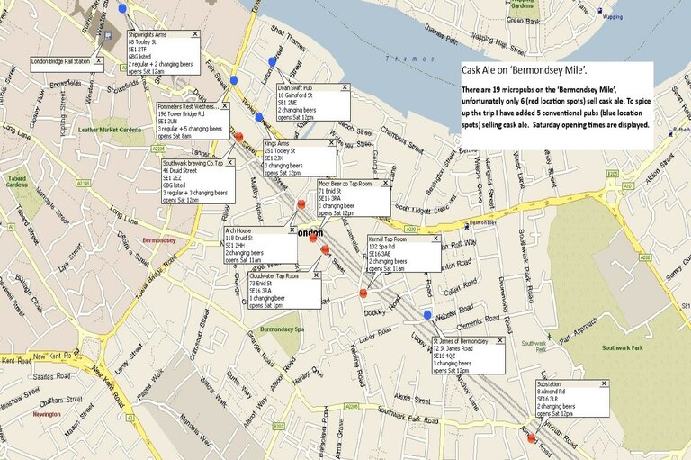 A walking tour of the Bermondsey Beer Mile . Of the official list of 19 micropubs, 6 sell cask ale and 5 'conventional' pubs are also along the route.